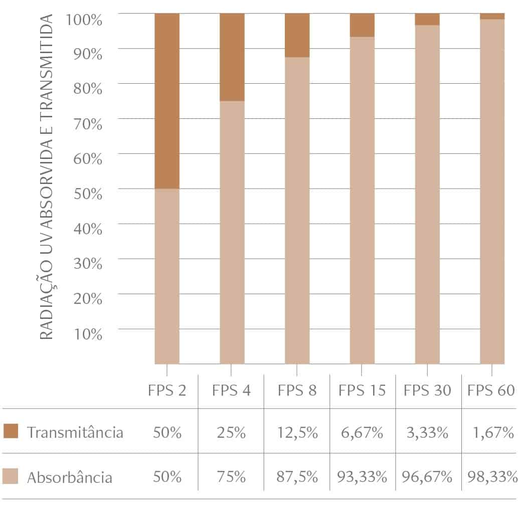 Logo, quanto maior a absorbância, menor a transmitância. Essa relação pode ser observada no gráfico abaixo, que traz a radiação UV absorvida (absorbância) e a quantidade transmitida (transmitância) de acordo com os valores de FPS de um protetor solar.