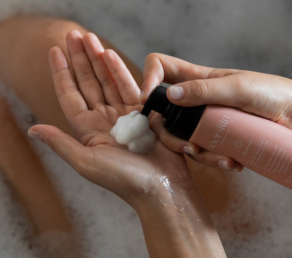 Ella Biome inicia o ritual, uma espuma prebiótica que limpa gentilmente, equilibrando o pH natural e o microbioma da região íntima.